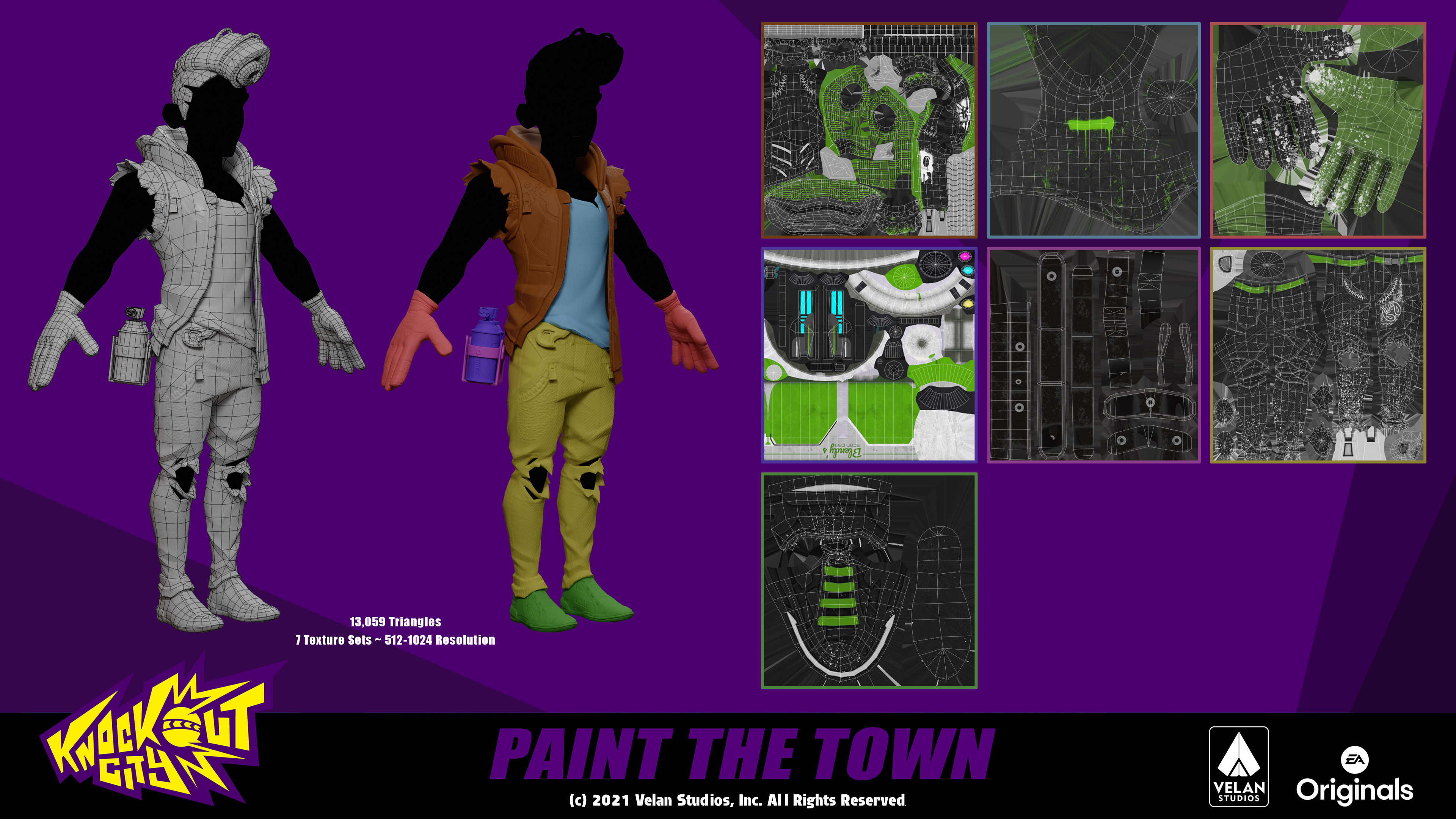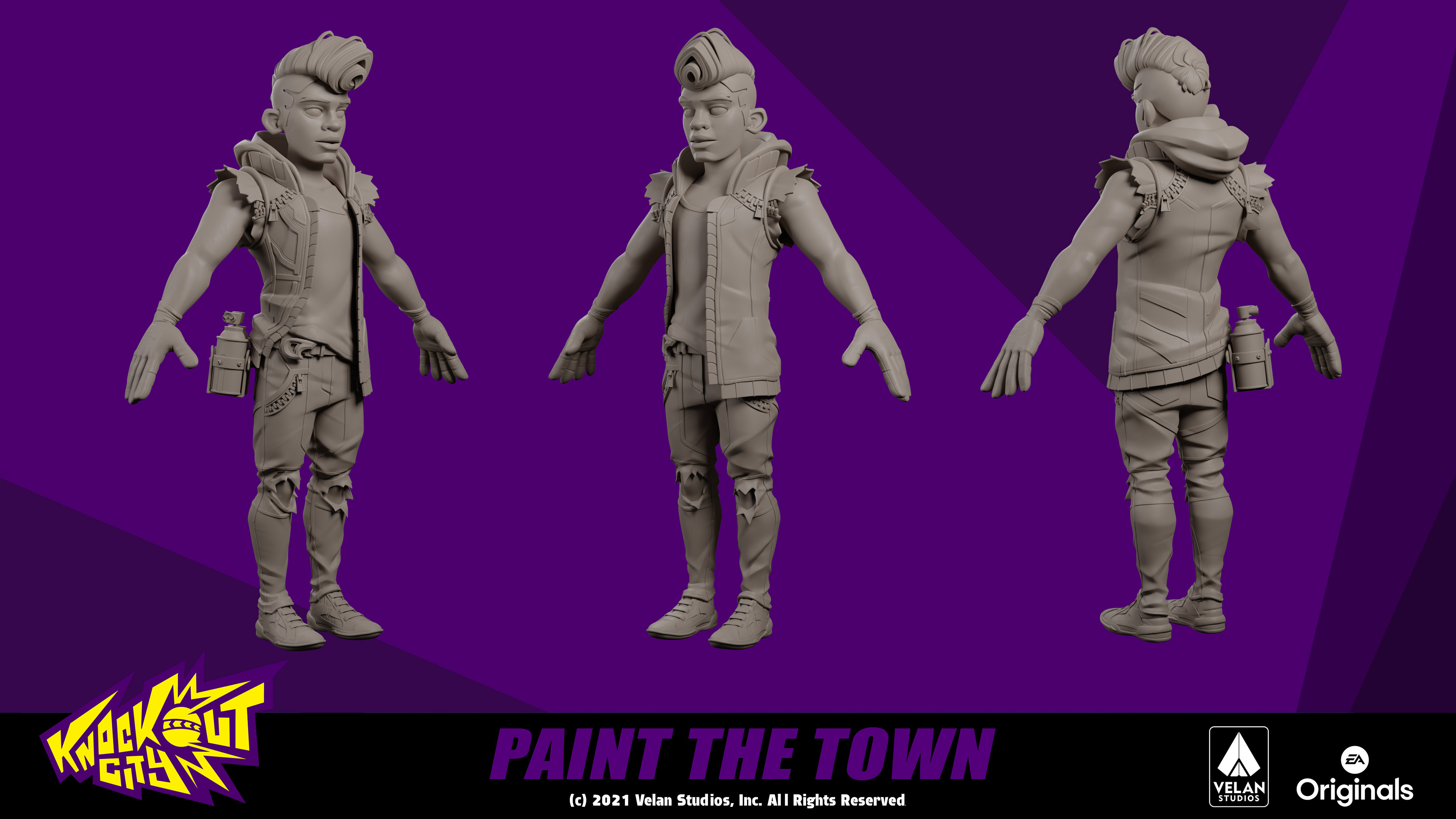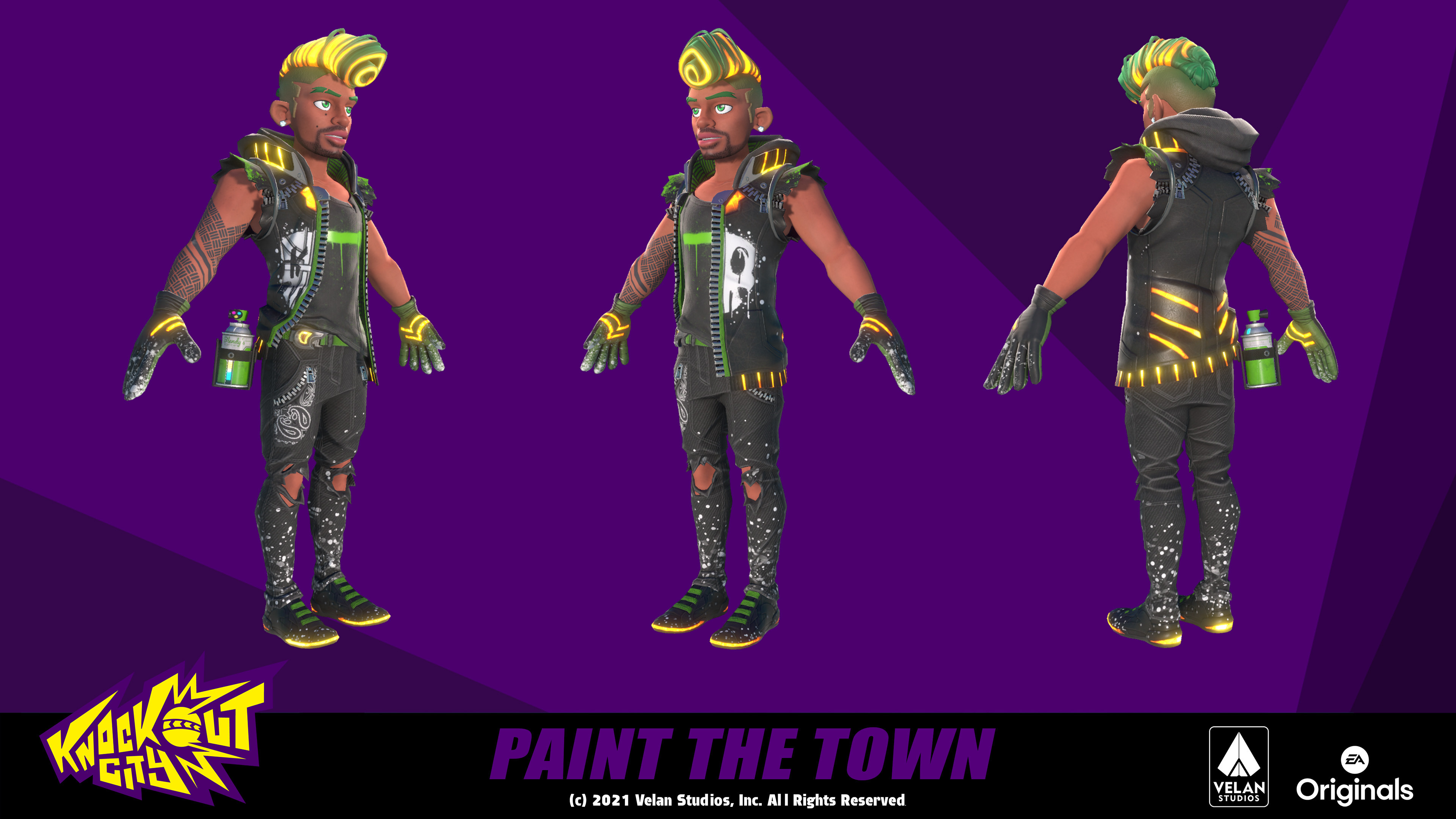 Paint The Town player skins for Knockout City by Velan Studios. Outfits, Hair, Headphones, Spray Cans, Gloves model, lookdev and VFX: John DeRiggi. Head model: Myself and James Weir. Hair lookdev: Stephanie Stoner. Base body model and head lookdev: James Weir. Concepts: Carmin Gerard. Rigs: Justin Prazen and Kyle Woodall. Animation: Derek Bonikowski and Dillon Guscott. Art Direction: Ben Greene. Zbrush, Maya, 3DCoat, Substance 3D Painter, Photoshop, Viper Engine
